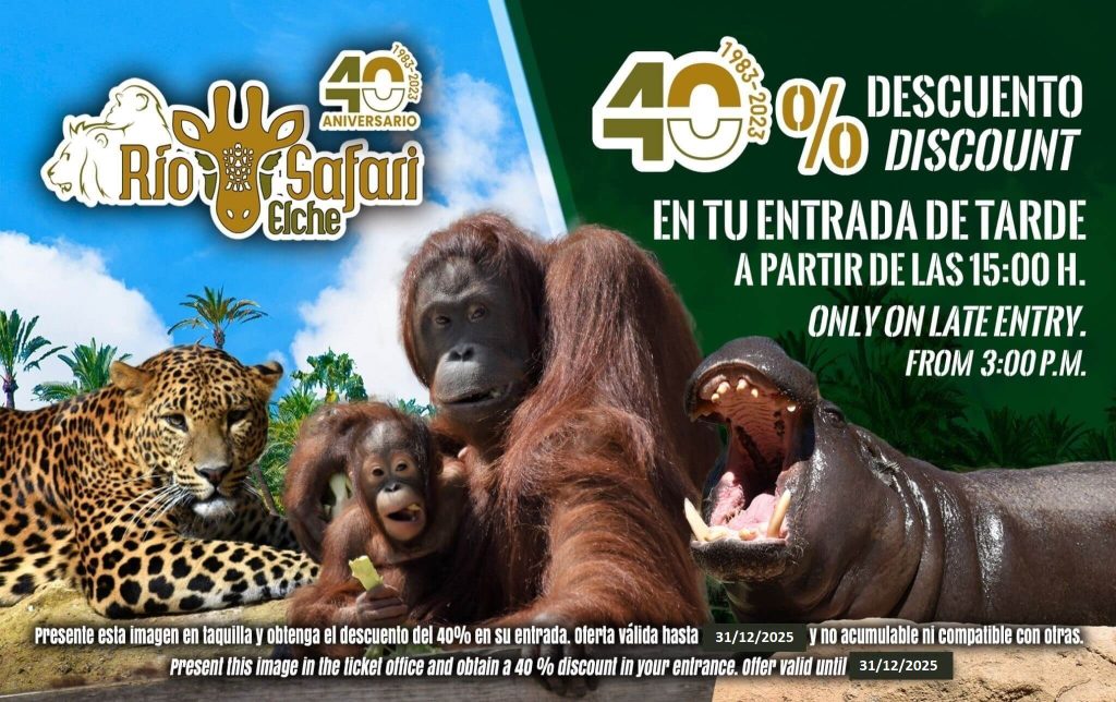 Desde el 13 de enero hasta el 2 de marzo de 2025 disfruta de un 40% de descuento en tu entrada a Río Safari Elche. Para obtener esta reducción hay que presentar en Taquilla el cupón que se muestra a continuación.